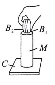 7. 我们试着做一个游戏:如图所示,将磁体$M$固定在铁块$C$上。用手将一元硬币$B_1$、$B_2$叠在一起,竖立在磁体上端,如将手指稍稍松开一小段距离,将观察到的现象是两个硬币的上端______(选填“合拢”或“分开”)。这是因为硬币被______,且两个硬币的上端是______(选填“异”或“同”)名磁极。