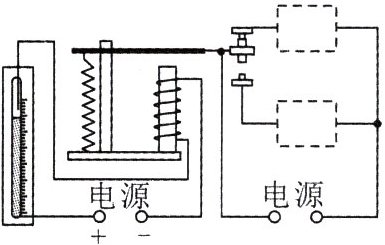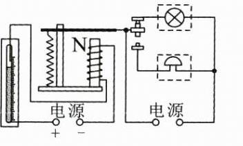 14. 如图所示是一种温度自动报警器原理示意图。当环境温度低于设定的警戒温度时,灯亮,电铃不响;当环境温度达到警戒温度值时,灯不亮,电铃响,发出报警信号。要求:(1)在图中的虚线框内填入相应的电路元件符号并补全电路;(2)标出通电螺线管的 N 极。