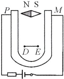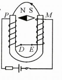 13. 如图所示,将一小段铁棒弯成“U”形,用通电导线在它的左右两支上各绕上几匝,便成了蹄形电磁铁,要求小磁针静止时指向如图所示。请从导线 P 端出发,在铁棒的左支上绕几匝,连接上导线 DE,接着在铁棒的右支上绕几匝,连接到导线的 M 端。绕线完毕后至少画一条磁感线。