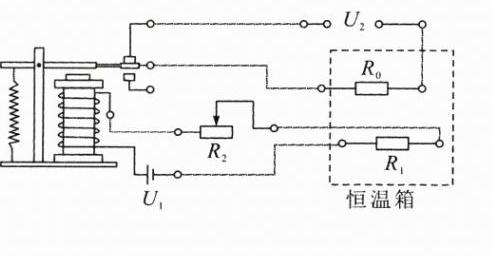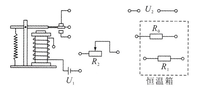 15. 如图是电加热恒温箱的原理图。控制电路由电源 U₁、电磁继电器、调温电阻 R₂ 和热敏电阻 R₁ 组成,其中热敏电阻 R₁ 随温度升高阻值减小,工作电路由电源 U₂ 和加热器 R₀ 组成,请按照题意用笔画线代替导线将图中的控制电路和工作电路连接完整。