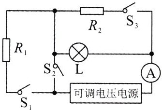 (2) 开关$S_{1}$、$S_{2}$闭合,$S_{3}$断开,小灯泡L接入电路,$R_{1}$被短路,$R_{2}$被断路;小灯泡L的实际发光功率$P=\frac{U'^{2}}{R_{L}}=\frac{(10\ V)^{2}}{8\ \Omega}=12.5\ W$