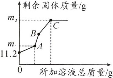 12.烧杯中现有质量为11.2 g的铁,先逐滴向烧杯中加入一定量的Cu(NO₃)₂溶液,充分反应后再逐滴加入AgNO₃溶液,剩余固体质量与所加溶液总质量的关系如图所示。下列说法正确的是 ( )