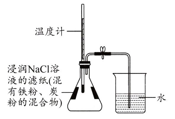 12.利用铁粉、炭粉、氯化钠进行铁的锈蚀实验(装置如图所示,装置气密性良好)。实验 1 min 后温度计读数上升,8 min 后打开弹簧夹,水倒吸入锥形瓶。实验数据如下表: