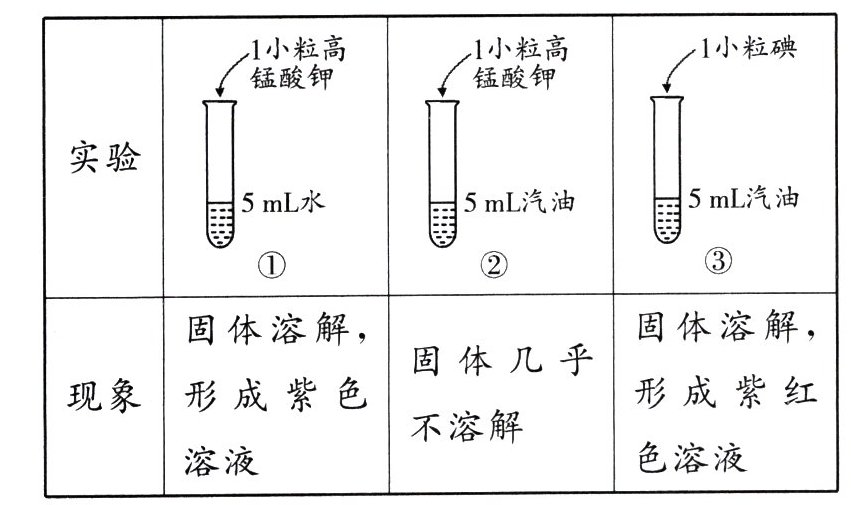 |现象|固体溶解,形成紫色溶液|固体几乎不溶解|固体溶解,形成紫红色溶液|