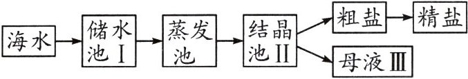 海水→储水池Ⅰ→蒸发池→结晶池Ⅱ→粗盐→精盐