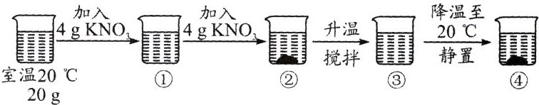 室温20℃ 20 g 加入4 g KNO₃ ① 加入4 g KNO₃ ② 升温 搅拌 ③ 降温至20℃ 静置 ④
