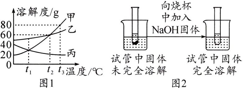 5.(2024·广元)甲、乙、丙三种固体的溶解度曲线如图1所示,如图2是选用图1中某种固体进行实验时的情况。下列说法正确的是 ( )