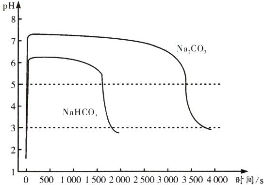 将上述实验中$Na_2CO_3$换成$NaHCO_3$,重复实验过程。所得两条曲线如图所示。