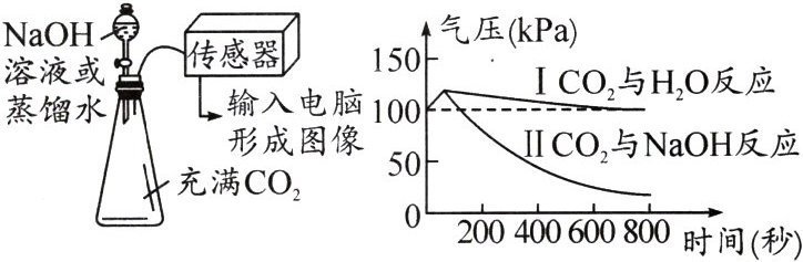 10.实验小组同学用压强传感器研究等量水或$NaOH$溶液分别吸收$CO_2$的效果,实验装置及测定结果如图所示。下列说法不正确的是 ( )