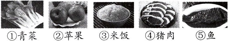 ①青菜 ②苹果 ③米饭 ④猪肉 ⑤鱼