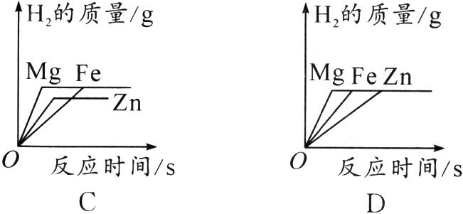 D. 三种金属与稀硫酸反应后溶液的质量:Mg<Fe<Zn