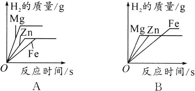 4. 将质量均为 10 g 的 Mg、Fe、Zn 三种金属分别放入质量和浓度均相同的三份稀硫酸中,反应完成后有 2 种金属剩余,则它们生成氢气的质量关系是 ( )
