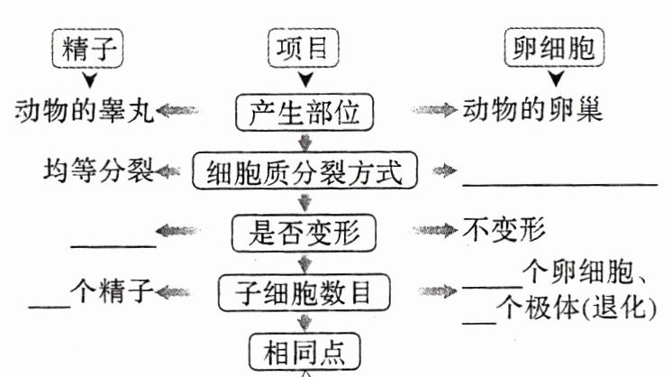 相同点 ①染色体都在减数分裂前的间期复制一次;②减数分裂Ⅰ都发生同源染色体分离;③减数分裂Ⅱ都发生着丝粒分裂,姐妹染色单体分开;④形成的精子和卵细胞中的染色体数目都减半