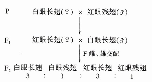 1.(2023·北京卷,4)纯合亲本白眼长翅和红眼残翅果蝇进行杂交,结果如图。$F_{2}$中每种表型都有雌、雄个体。