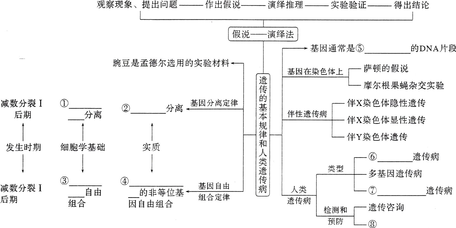 ①同源染色体 ②等位基因 ③非同源染色体 ④非同源染色体上 ⑤有遗传效应 ⑥单基因 ⑦染色体异常 ⑧产前诊断