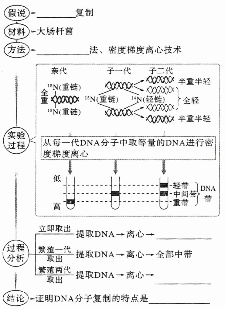 1. 半保留 同位素标记 全部重带 $\frac{1}{2}$轻带、$\frac{1}{2}$中带 半保留 复制
