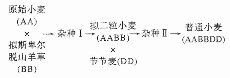 C [据题图可知,原始小麦染色体组成是 AA,拟斯卑尔脱山羊草染色体组成是 BB,两者杂交后代染色体组成是 AB,不能产生可育后代,故原始小麦和拟斯卑尔脱山羊草存在生殖隔离,A错误;拟二粒小麦染色体组成是 AABB,属于异源四倍体,正常可能会产生 AB 一种类型配子,B错误;杂种Ⅰ染色体组成是 AB,细胞中有 14 条染色体,处于有丝分裂后期的细胞中染色体数目加倍,含有 28 条染色体,C正确;原始小麦是二倍体,普通小麦是异源六倍体,普通小麦茎秆粗壮,种子大,营养物质含量高,D错误。]