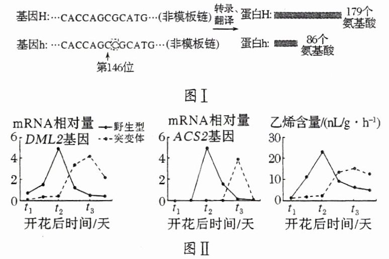 (2)图Ⅱ中,t₁~t₂时段,突变体番茄中DML2基因转录的mRNA相对量低于野生型,推测在该时间段,H蛋白对DML2基因的作用是________________。突变体番茄果实成熟期改变的可能机制为:H突变为h后,由于DML2基因的作用,果实中ACS2基因________________________,导致果实成熟期________(填“提前”或“延迟”)。