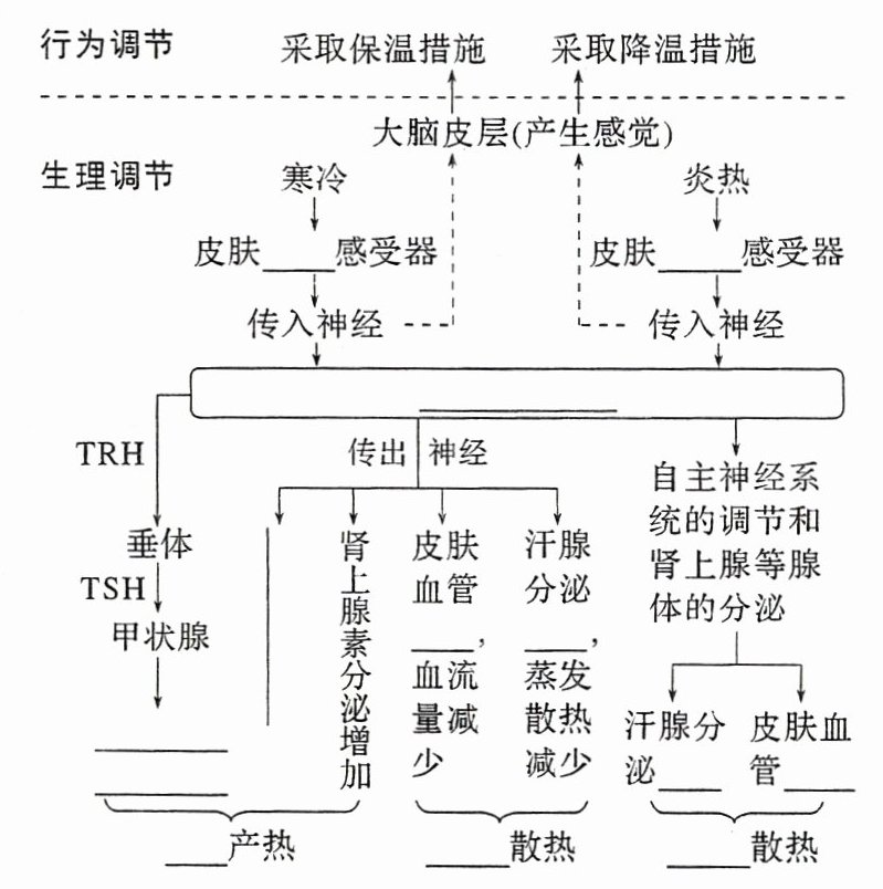 (2)冷觉 热觉 下丘脑 甲状腺激素增加 骨骼肌战栗 增加 收缩 减少 减少 增多 舒张 增加 ①神经—体液 ②肾上腺素 甲状腺激素 下丘脑和垂体 协同