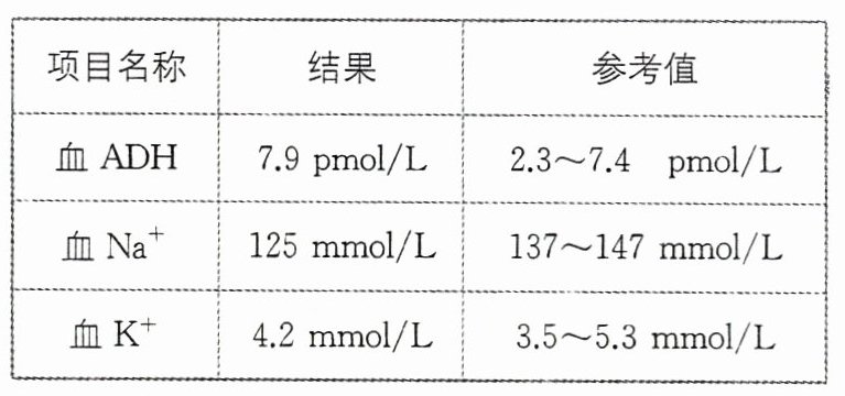 2.(2023·重庆卷,6)某人头部受伤后出现食欲不振、乏力等症状,经检查后被诊断为抗利尿激素(ADH)分泌失调综合征,其部分化验结果见下表。下列关于该患者的叙述,错误的是 ( )