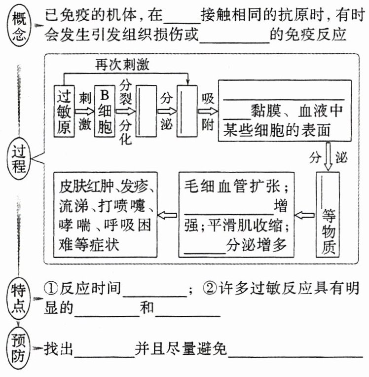 再次 功能紊乱 浆细胞 抗体 皮肤、呼吸道或消化道 血管壁通透性 腺体 组胺 有快有慢 遗传倾向 个体差异 过敏原 再次接触该过敏原