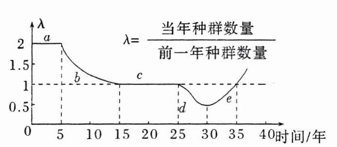 ⑤e段——虽然λ呈上升趋势,但仍未达到1,故种群数量逐年下降。