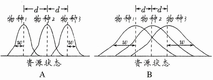 ②举例:如图为3个共存物种对资源利用的曲线。图A和图B中3个物种的资源利用状况不同。