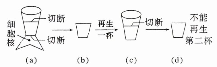 提示 决定杯状藻藻杯的形态发生的遗传信息来自细胞核;(b)能再生一杯(c)是因为(b)中含有由细胞核转录而来的遗传信息