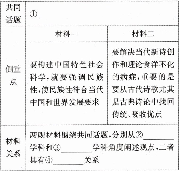 |侧重点|材料一:要构建中国特色社会科学,就要强调民族性,使民族性符合当代中国和世界发展要求|材料二:要解决当代新诗创作和理论食洋不化的病症,重要的是要从古代诗歌尤其是古典诗论中找回传统、吸收优点|