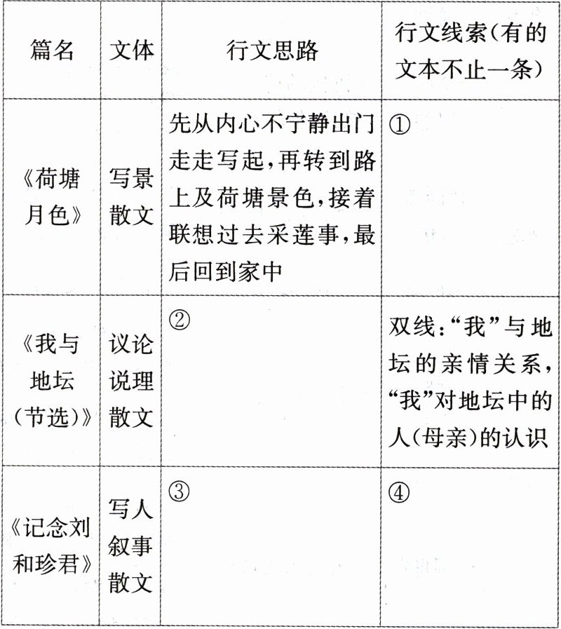 |《我与地坛(节选)》|议论说理散文|②____|双线:“我”与地坛的亲情关系,“我”对地坛中的人(母亲)的认识|