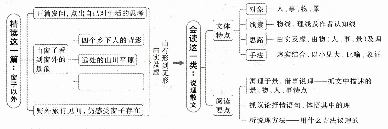|议论说理散文|对现实的事、物有触动(触发点)→类似事情相近或相反联想议论(联系点)→点出道理(感悟点)→结合现实,议论升华(升华点)|
