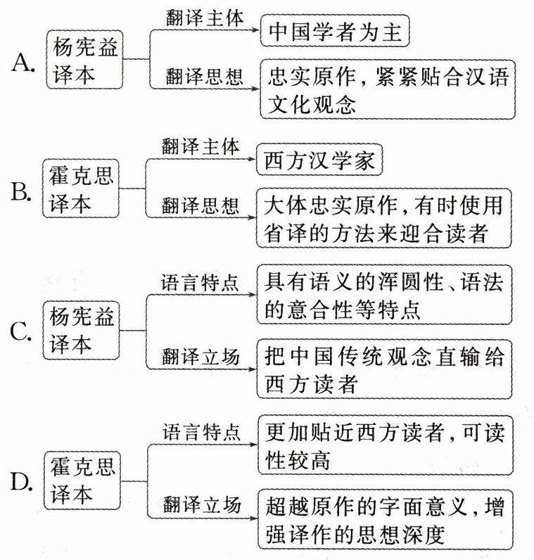 C项中杨宪益译本“具有语义的浑圆性、语法的意合性等特点”,该相关内容来自材料一“中国古代经典文本的语言具有语义的浑圆性、语法的意合性和修辞的空灵性这三大特点”的表述,可见此处将中国古代经典文本的语言特点与杨宪益英译本的语言特点混为一谈。杨宪益译本的翻译立场来自材料三“杨译本不可遢制地透露出把中国文化传统及其风俗观念直输给西方读耆的翻译立场”的表述,可见C项关于杨宪益译本翻译立场的表述是正确的。综合来看,C项也是错误项。D项中霍克思译本的语言特点来自材料三“他使用西方本土读者谙熟且可以接受的地道的英语及其文化、风俗等观念”,可以看出霍克思在翻译时并没有止于筒单的语言文字转换,他还关注着自己译本的传播、接受与影响。在跨文化交流的语境下,接地气的翻译方法更容易得到市场的认可,霍克思的翻译语言在当时得到了更多西方读者的欢迎。因此D项中霍克思译本的语言特点的相关表述是正确的。霍克思译本的翻译立场同样来自材料三。“霍译本的翻译立场与翻译策略超越了汉语《红楼梦》的字面意义,而旨在探求汉英双语背后两种异质文化观念之间相互理解与解释的适应性。”可以看出,“超越原作的字面意义”在原文中是有依据的,但是“增强译作的思想深度”的表述在原文中却无法推出,而且一般而言,霍克思译本的思想深度也很难超越原蓍《红楼梦》。因此D项也是错误项。