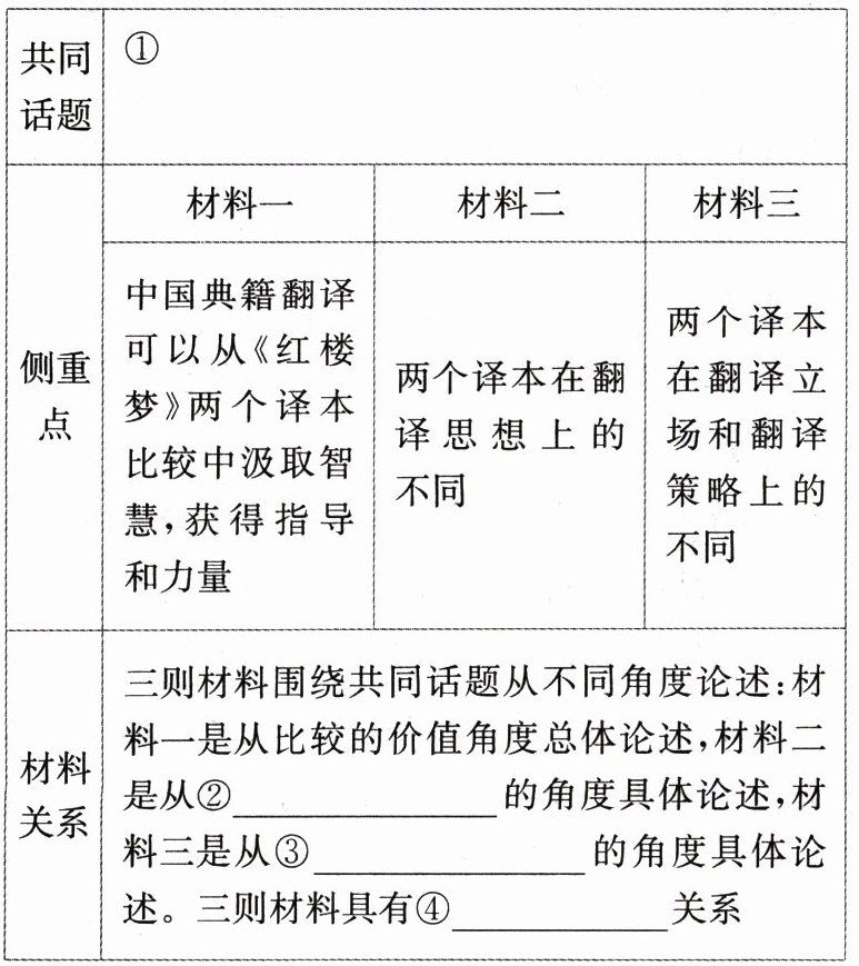 答案③的前半句来自材料三。“霍译本的翻译立场与翻译策略……旨在探求汉英双语背后两种异质文化观念之间相互理解与解释的适应性。他使用西方本土读者谙熟且可以接受的地道的英语及其文化、风俗等观念,以此来创造性、补充性与生成性地重构《石头记》。”答案③的后半句来自材料一。“促进中西文化的交流和发展,让西方了解真正的中国。”中国的文学典籍要走出去,翻译是必经之路,而这条道路的障碍主要在于语言文字的翻译问题。语言的翻译不可能是机械的一一对应,语言的翻译需要承载的是文化差异的交流,译文不能仅仅局限于语言层面的准确与忠实,更要考虑作品的传播、接受与影响。因此优秀的典籍译本应该可以引发国外读耆的关注,并得到其认可,以此达到文化交流的目的。追加练习