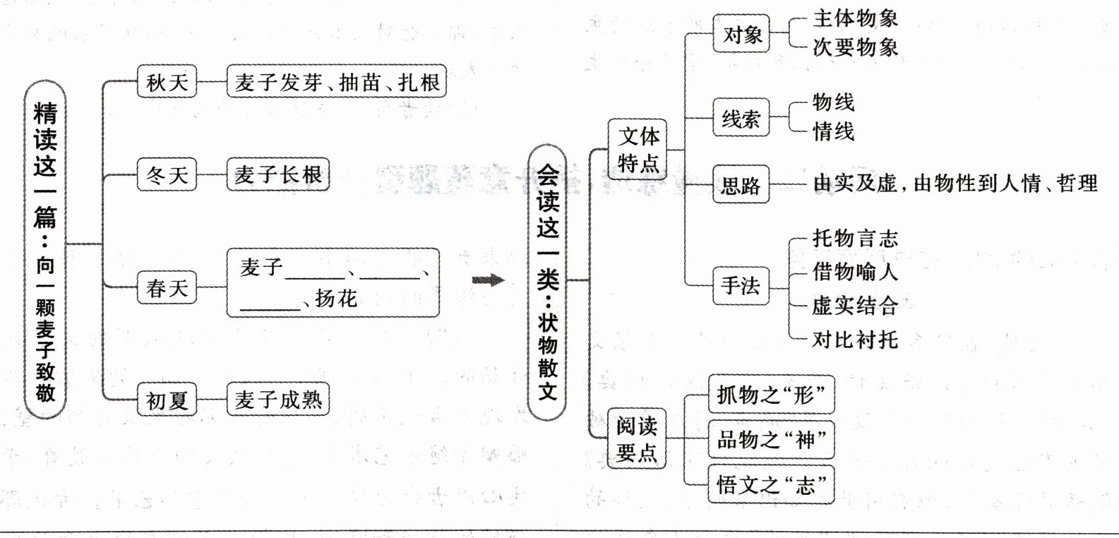 活动一 精读这一篇,会读这一类 分蘖 拔节 抽穗 练透这一群,会做这一类 1.(1)勇士:麦子不惧寒冷的历练和锻造。伴着秋风出生(发芽),在深秋长出秧苗,伴着寒霜成长,在冬季扎根。 (2)智者:麦子懂得积蓄力量,厚积薄发。在万物停止生长的冬季,努力向下发展它庞大的根系,为成长成熟做好准备。 (3)仁人:麦子平凡、普通、大众,却无怨无悔地养活着地球上1/4的人口。 (4)麦子简单、憨厚、朴实,为了成熟这一目标,一直勇往直前。 解析 抓住文中的议论抒情文字及描写麦子的情感语言即可。 2.(1)麦子自播种后,便迎着凛冽的朔风发芽、抽苗、扎根,经历寒霜与风雪,终于在春天分蘖、拔节、抽穗、扬花,直至成熟,运用了比喻的修辞手法,生动形象地写出了麦子在成长过程中的艰辛及锤炼,表现了麦子的顽强生命力;以及为了追求目标心无旁骛、坚持不懈、养精蓄锐,表达了“我”对麦子的赞美与敬佩之情。(2)总结全文,深化中心。 解析 分析时一定要抓住该句的特点:文末句、比喻句。