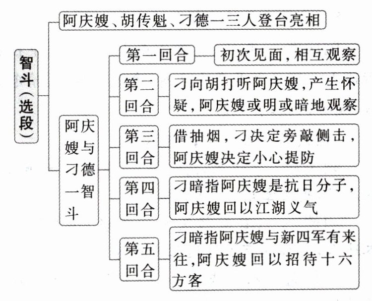 @@6.①阿庆嫂:沉着冷静,不卑不亢,机智勇敢,应付灵活得体。②刁德一:阴险,狡诈,多疑。③胡传魁:愚蠢,有匪气。