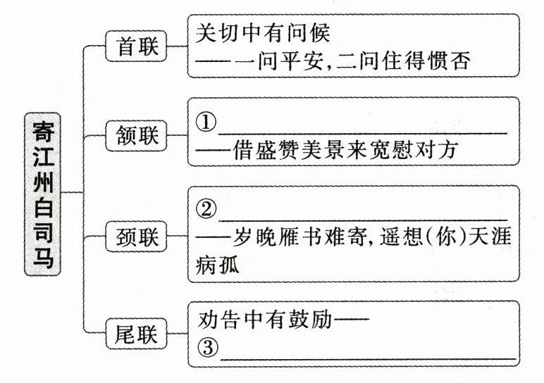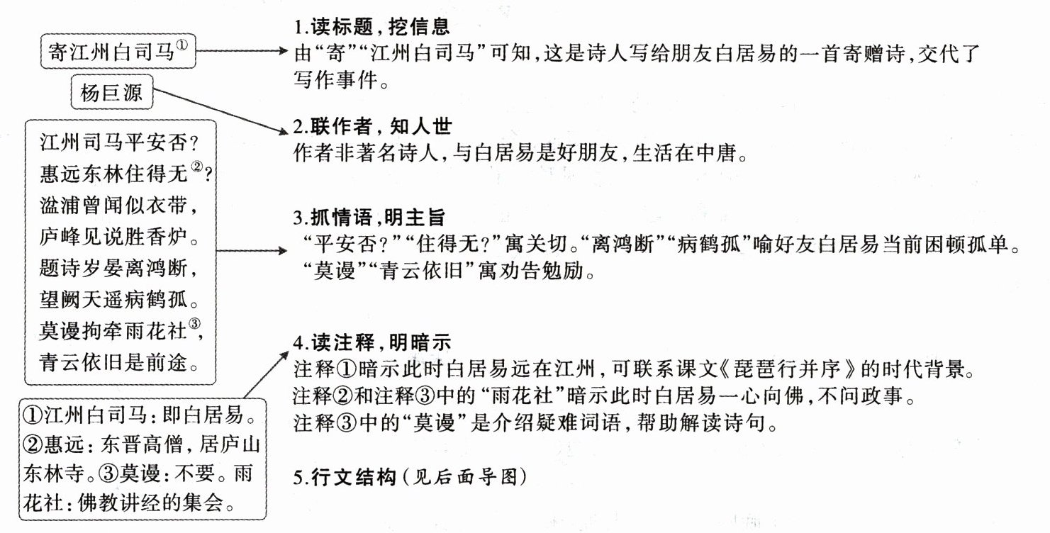 2. ①“劝诫”是这首诗的主旨,诗人在尾联点明该主旨,劝说白居易不要沉迷于宗教,消磨了志气,要对人生充满信心;②诗歌的第二句在问候中提到僧人和寺庙,为结尾正式的劝诫做了铺垫。