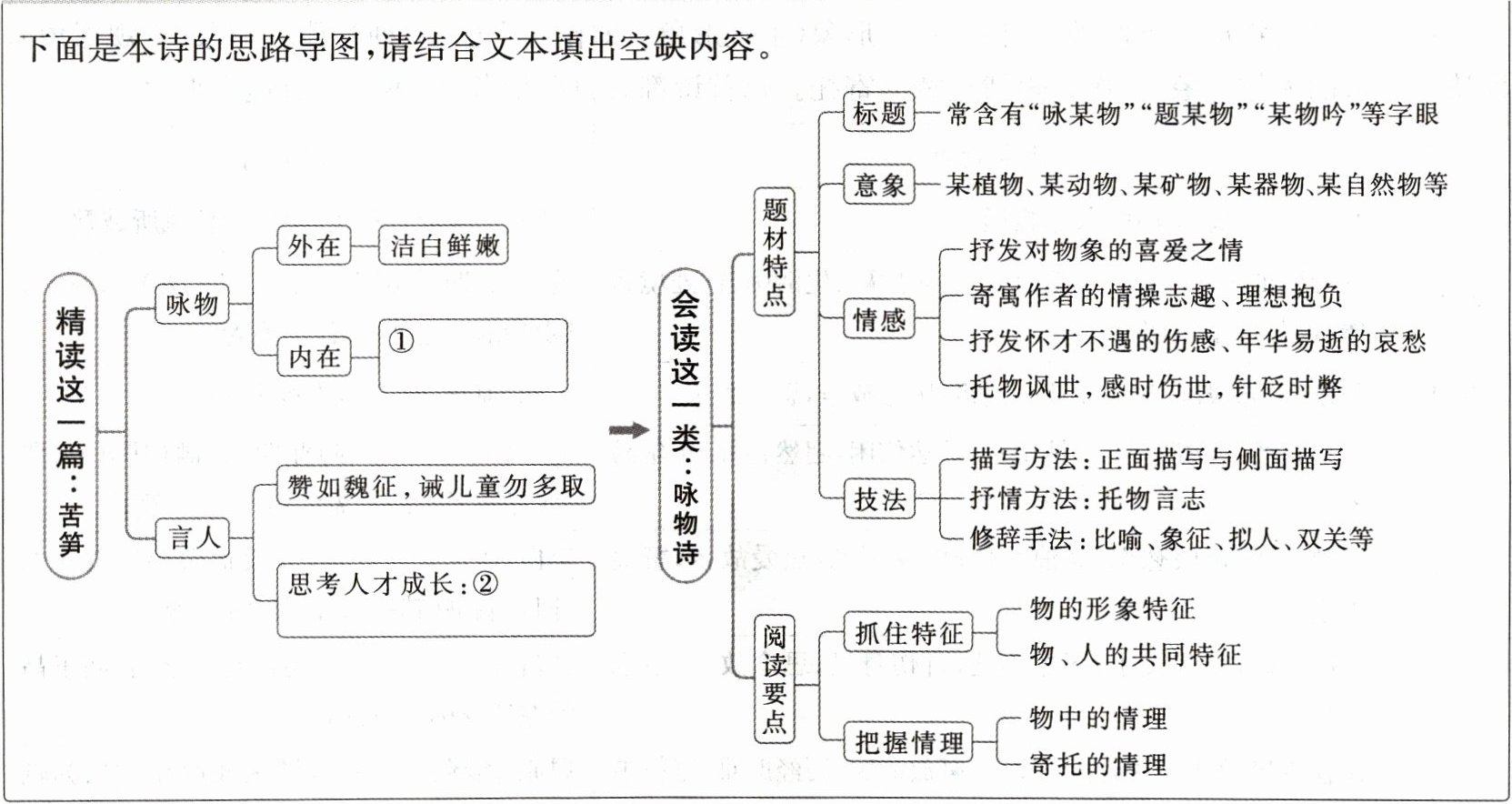 解析 这是一首托物抒怀诗,借歌咏苦笋告诉人们做人应高风亮节,刚正不阿。由物及人,找出苦笋、魏征二者的相似点进行分析,组织语言作答即可。如:苦笋“苦节”与生俱来,口感苦涩,一些人不喜欢;魏征常常“犯颜直谏”,其言行常令人难以接受。“极知耿介种性别”的意思是,深知苦笋耿介的性格与别的品种不同,苦笋象征耿介性格,魏征方正不阿,二者相似。