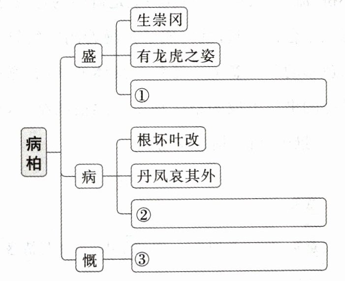 3. ①这首诗主要运用了病柏、丹凤、鸱鸮三种意象。②柏由盛而衰的变化,象征了唐朝从强盛到衰落的沧桑巨变;丹凤哀鸣,象征了正直之人被摈斥在外;鸱鸮意满,象征了奸佞小人盘踞于朝中。诗人借助这些意象表达了对国运时局的忧虑。