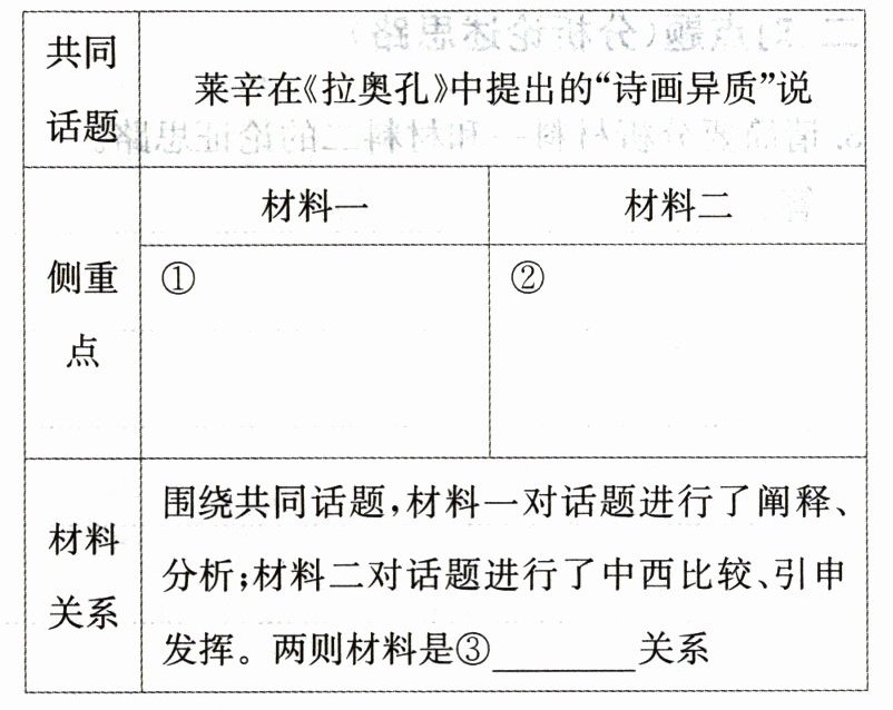 3. ①材料一围绕莱辛《拉奥孔》提出的“诗画异质”观,从缘由、推论到结论,纵向展开,引述其观点,并结合作者个人的理解,以举例、引证的方法加以阐释;②材料二点出莱辛“诗画异质”的核心观点后,以札记形式列举中国古人关于诗画关系的相关讨论,与莱辛观点形成照应。