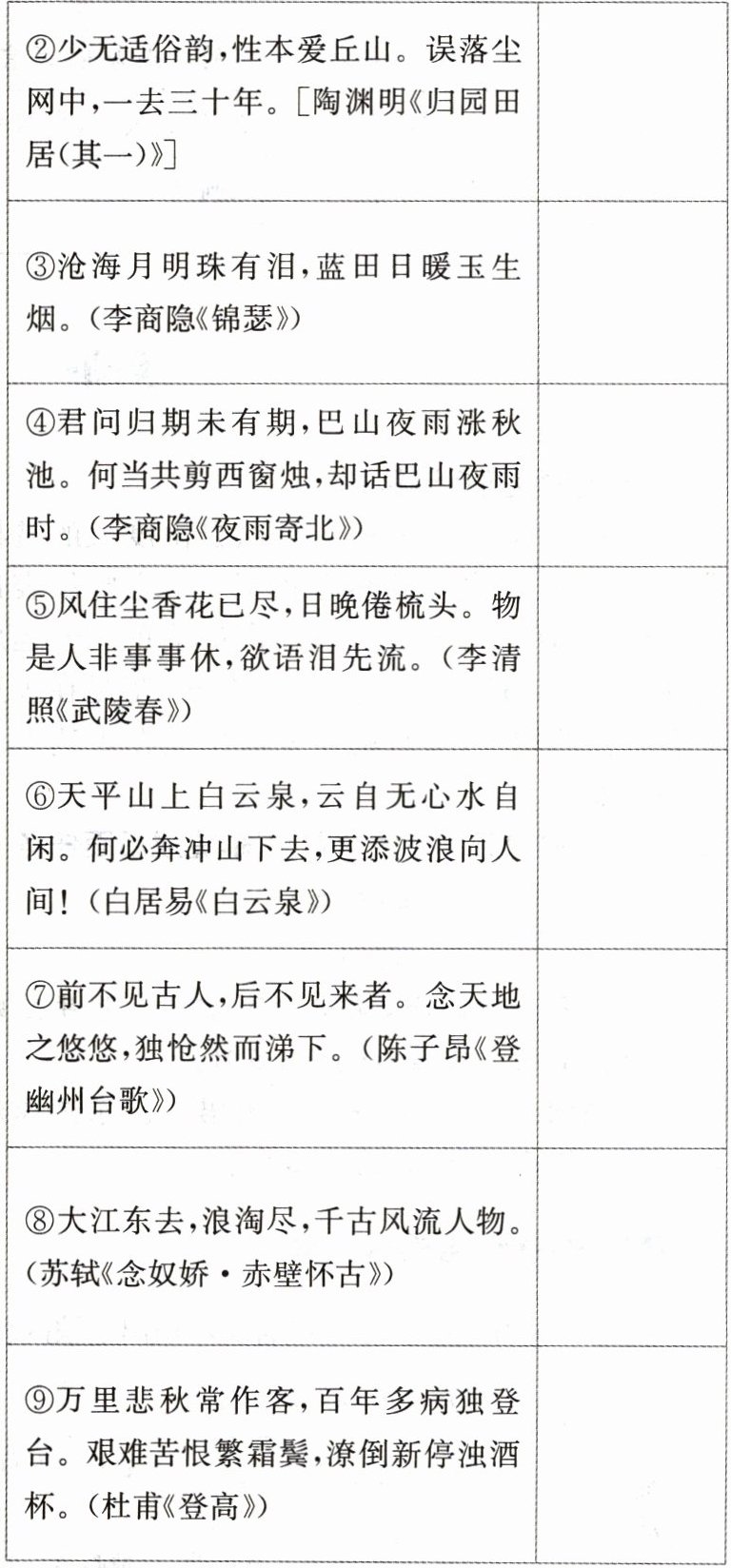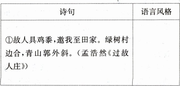 请判断下列诗句的语言风格。(从表格后选相应的字母填入表中)