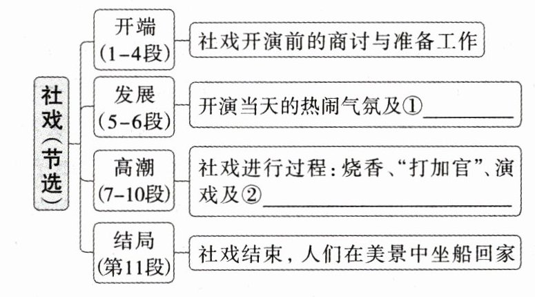 3. ①正面描写:依次写了社戏过程中的各种仪式,如选址、择日、开锣时的祭拜、开锣后“打加官”、戏目的安排等。②侧面描写:通过描写各色人物举止、伏波宫前的集会场面等,来衬托社戏的仪式感。