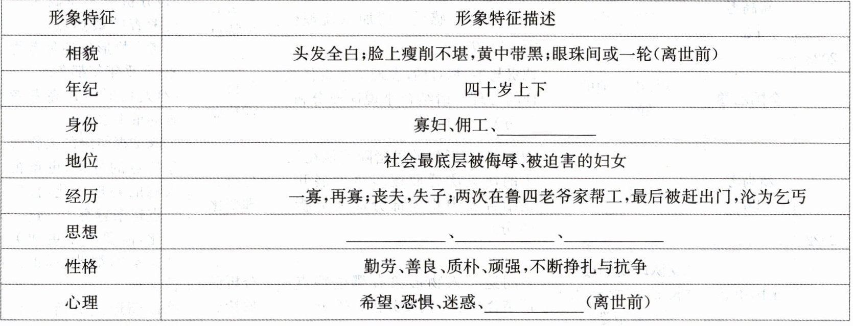 温习鲁迅的小说《祝福》,填写下表空缺内容,感知祥林嫂的形象特征。