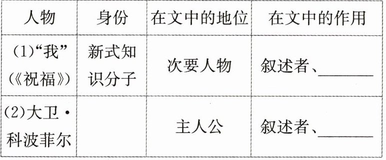 [关联教材] 温习鲁迅《祝福》和狄更斯《大卫·科波菲尔(节选)》两文中有关“我”的内容,填写下表空缺内容。