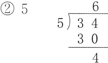 ① 6 ② 5 $\begin{array}{r}6\\5\enclose{longdiv} {34}\\30\\\hline4\end{array}$
