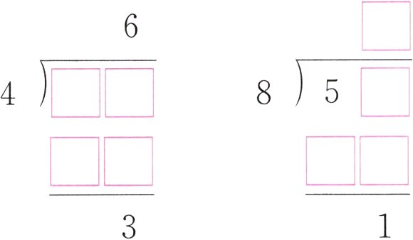 $\begin{array}{r}6\\4\enclose{longdiv} {\square\square}\\\square\square\\\hline3\end{array}$ $\begin{array}{r}\square\\8\enclose{longdiv} {5\square}\\\square\square\\\hline1\end{array}$