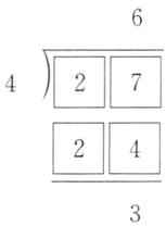 $\begin{array}{r}6 \\4\enclose{longdiv}{27} \\\underline{24} \\3\end{array}$