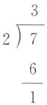 $\begin{array}{r}3 \\2\enclose{longdiv}{7} \\\underline{6} \\1\end{array}$