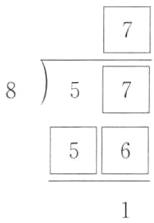 $\begin{array}{r}7 \\8\enclose{longdiv}{57} \\\underline{56} \\1\end{array}$