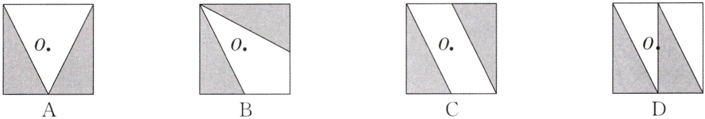 13. (2024·广州)下列图案中,点O为正方形的中心,涂色部分的两个三角形能够完全重合,则涂色部分的两个三角形关于点O成中心对称的是 ( )