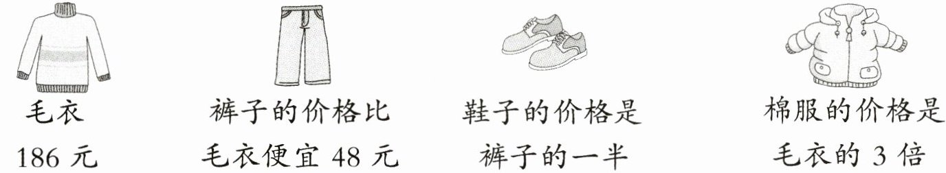 (2)186 - 48 = 138(元) 138÷2 = 69(元) 答:鞋子的价格是69元。